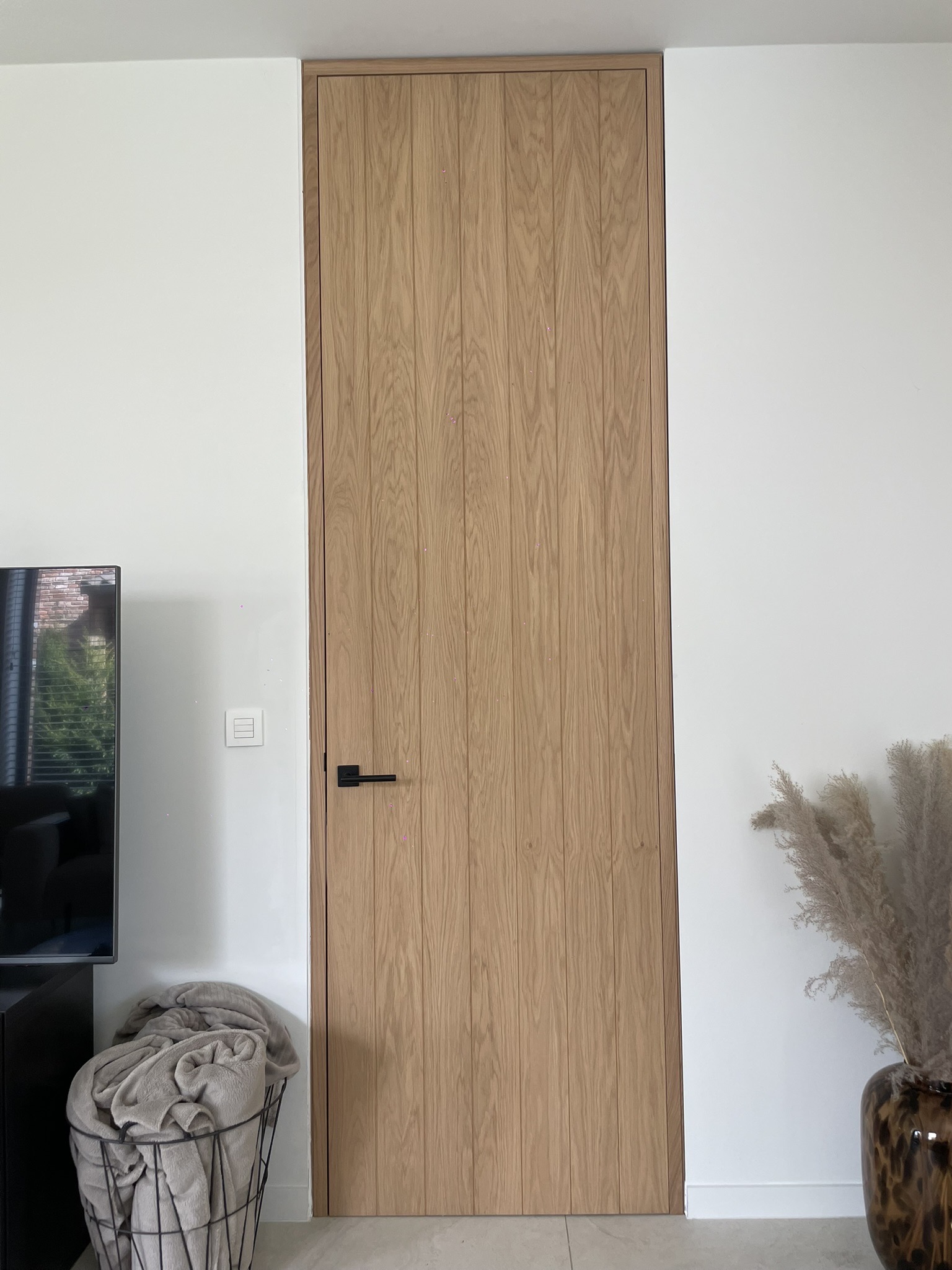 Voor een strakke look: het deurvlak ligt gelijk met de muur. Onzichtbare scharnieren en strakke belijning zorgen voor een minimalistische afwerking in moderne interieurs.