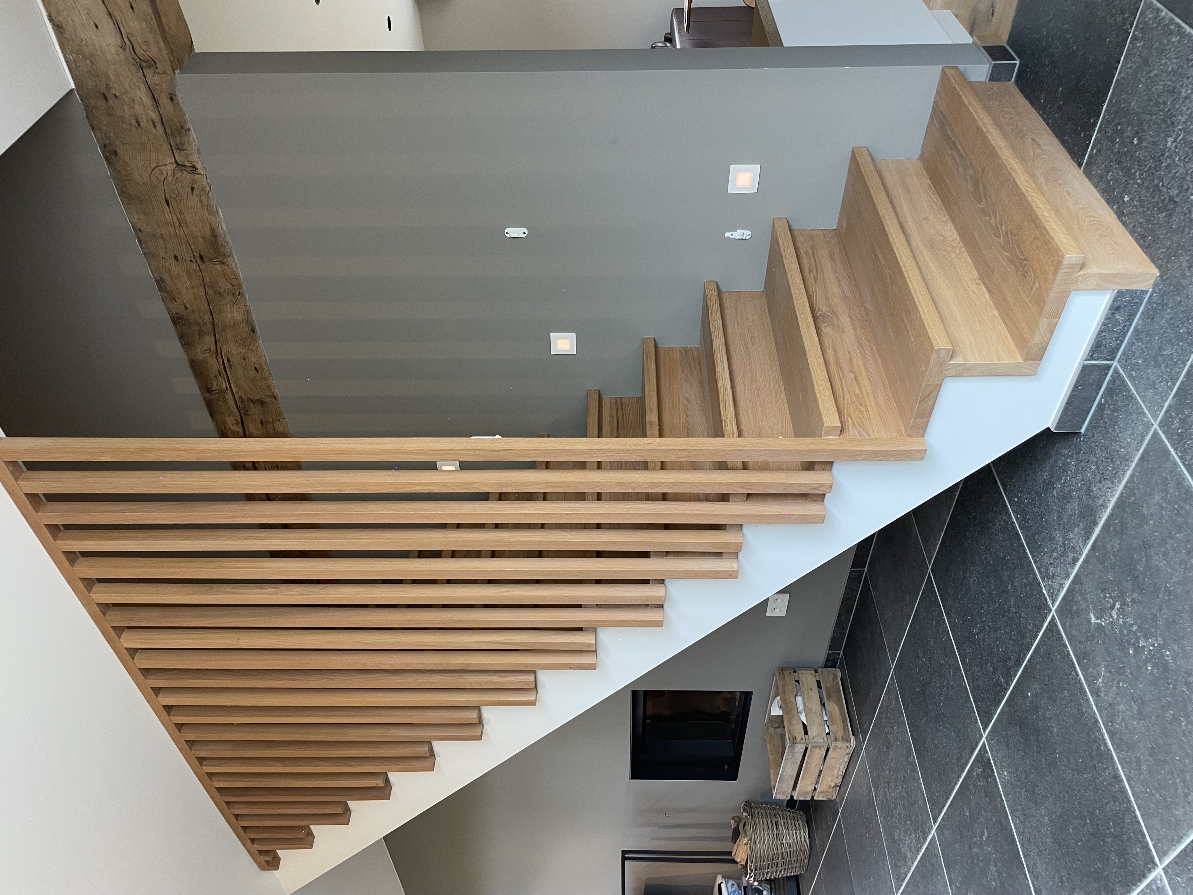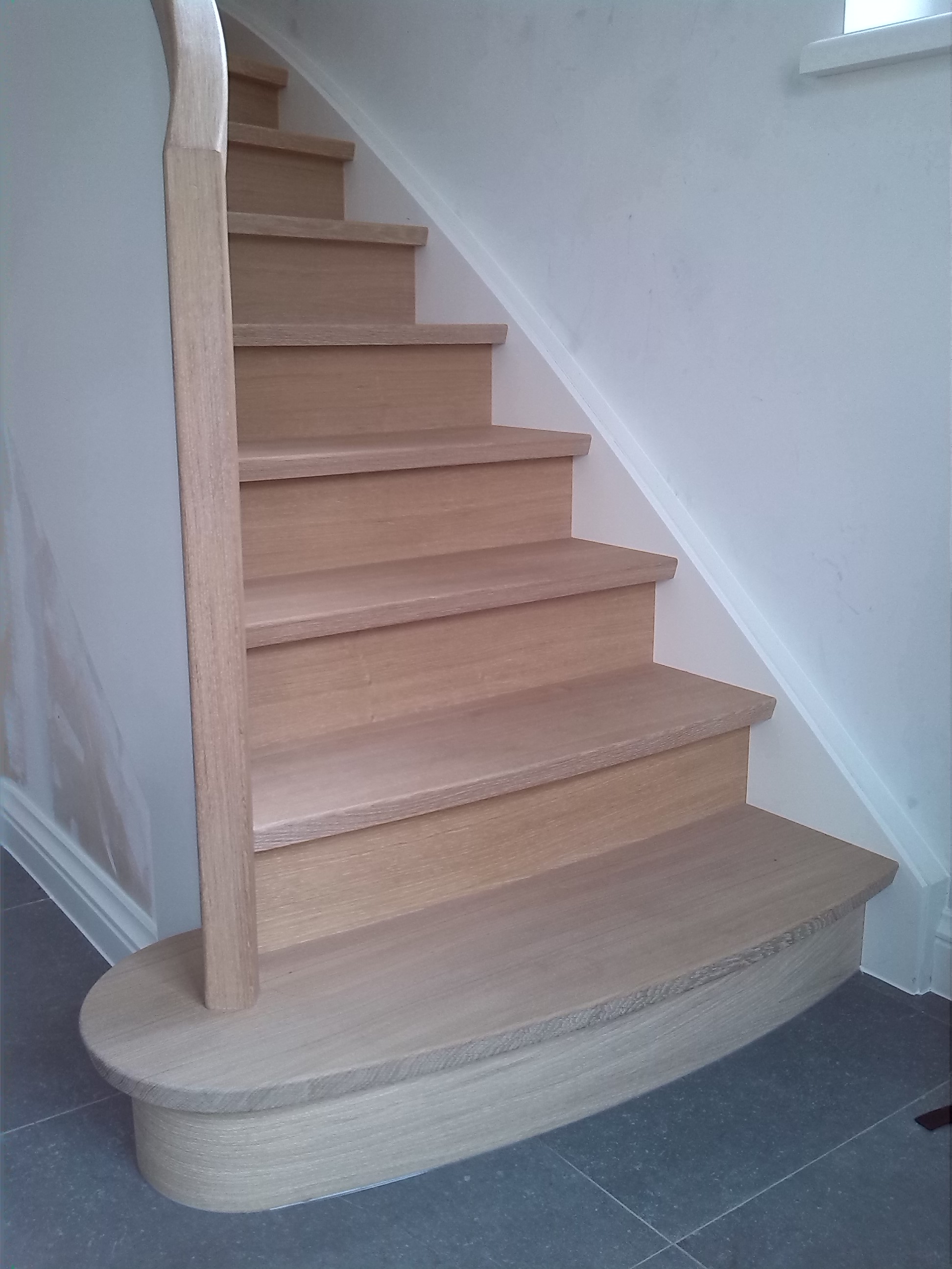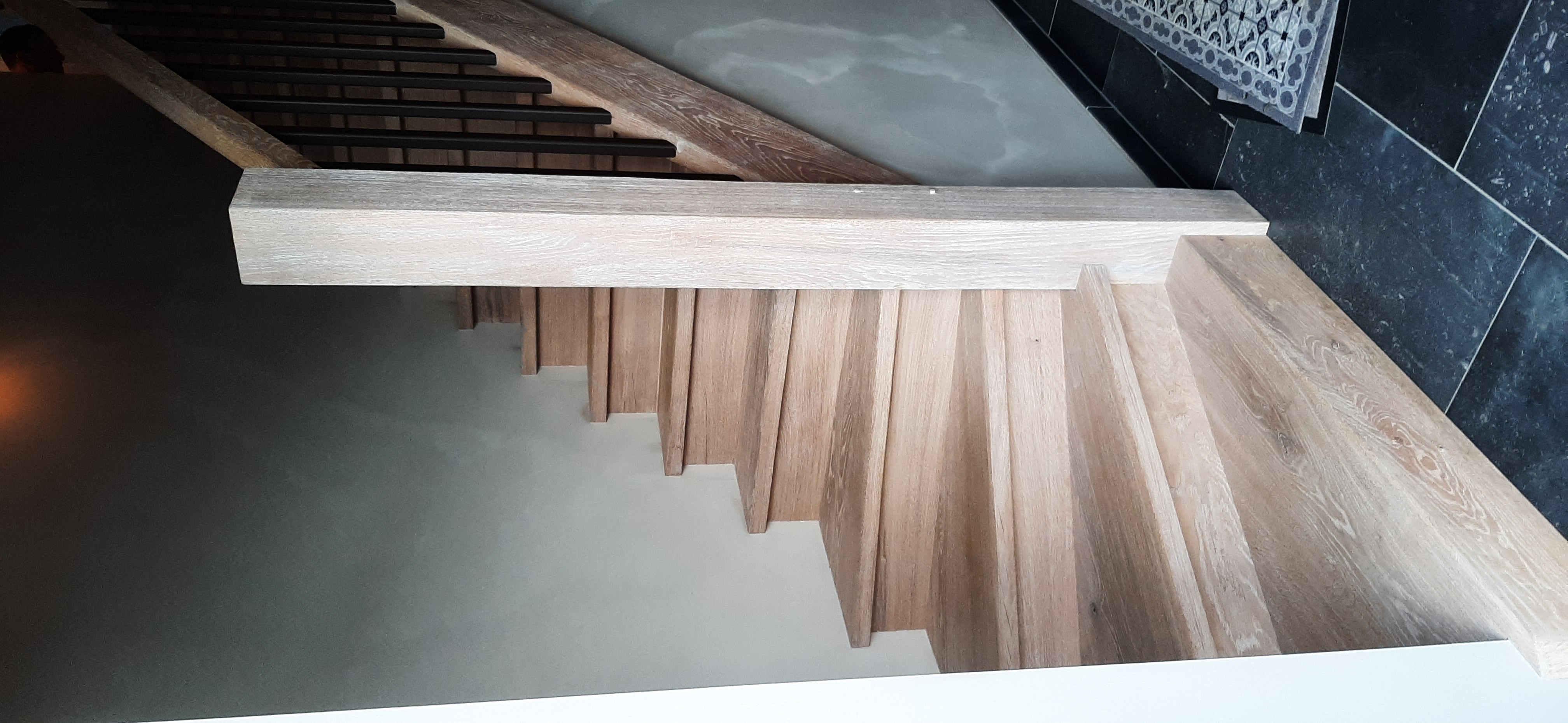 We werken met verstekverbindingen, onzichtbare bevestigingen en zachte afrondingen waar nodig. De afwerking – olie of lak – is slijtvast, onderhoudsvriendelijk en kan bij schade lokaal hersteld worden. Zo blijft je trap jarenlang even mooi als op dag één.